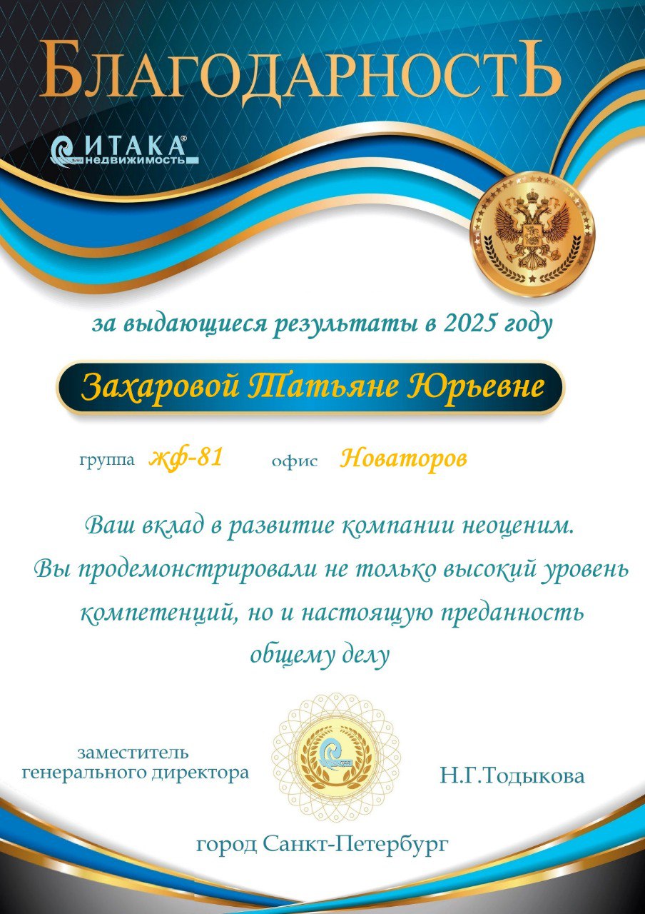 Хотим выразить огромную благодарность Захаровой Татьяне Юрьевне за профессионализм и оперативность! Благодаря ей мы успели воспользоваться одобренной семейной ипотекой, срок который уже подходил к конце. Татьяна Юрьевна помогла нам найти просторную 3-комнатную квартиру, полностью соответствующую нашим запросам. Очень довольны результатом и работой агента! Рекомендуем Татьяну Юрьевну как внимательного, ответственного и грамотного специалиста. Спасибо!