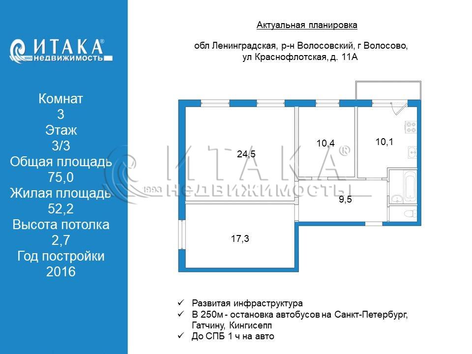ВНЕСЕН АВАНС, СПб 65км от КАД, город Волосово Волосовский район Ленинградской областиПродается 3 комнатная квартира! общая площадь – 75 м2, комнаты –24.5 17.3 10.4 м2, кухня – 10.1 м2, на 3/3 этаже панельного дома 2016 года постройки. Теплая, светлая квартира:• Стеклопакеты в комнатах, кухне, балкон• Установлены счетчики• Входные двери – металлические• Центральные удобства: отопление, холодная вода, газ, горячая вода• Новая сантехника• Санузел раздельный Кухня в подарок, техника и мебель по договоренности. Чистая парадная В городе есть вся необходимая для жизни инфраструктура: детсады, школы, спортивный комплекс Олимп с бассейном, Дом Культуры, почта, Банки, ЦРБ, поликлиники, Баня, сетевые магазины «Пятерочка», «Магнит», «Верный», Храм; Сообщение: в 250м - остановка автобусов на Санкт-Петербург, Гатчину, Кингисепп. Ж/д станция Волосово - 2км;Вы будете жить в зелёном уютном городке, где есть все необходимое для жизни, а до Северной столицы - всего 1 час на автомобиле! До г. Гатчина – 35км. В собственности у одного собственника! Прямая продажа! Работаем с субсидиями, ипотекой (поможем с одобрением), материнским капиталом. Рассмотрим предложения покупателя. Звоните, Анна