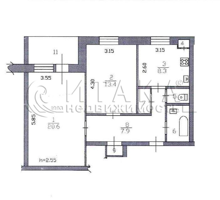 2-комнатная квартира 55.7 м², этаж 3/4