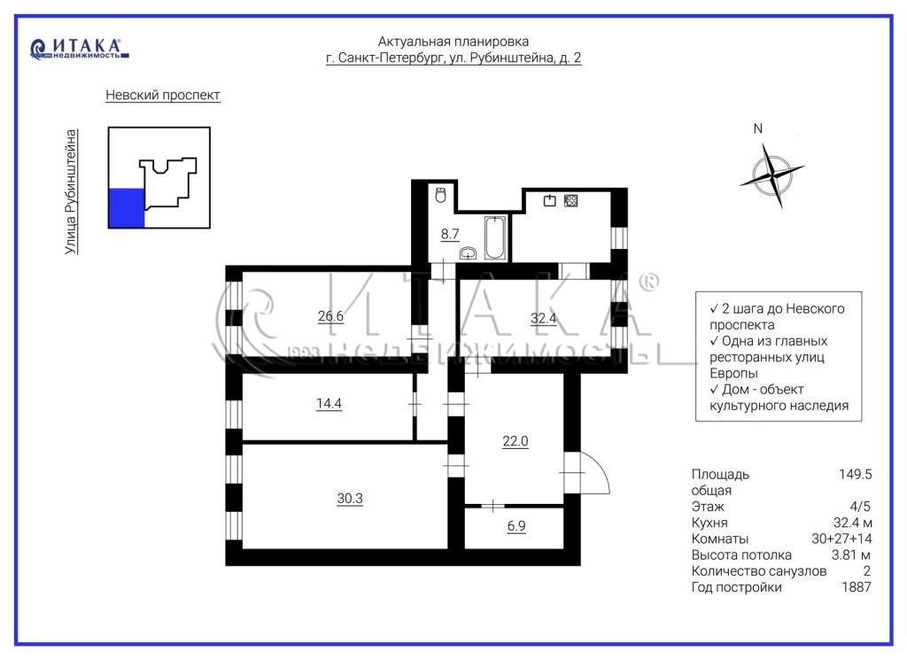 Если вы хотите жить в интересном месте, где сочетается деловая культурная жизнь Северной столицы, где в шаговой доступности музеи, театры и лучшие рестораны города - это квартира для Вас! Парадный вход с мраморной лестницей, хороший лифт (Отис). Окна квартиры на обе стороны: на улицу Рубинштейна и во двор. Сделан добротный ремонт, 2 санузла, высота потолка 3,81, комнаты все изолированные, кухня-столовая 31 кв.м и большой холл. Просмотры в любое время по договоренности.