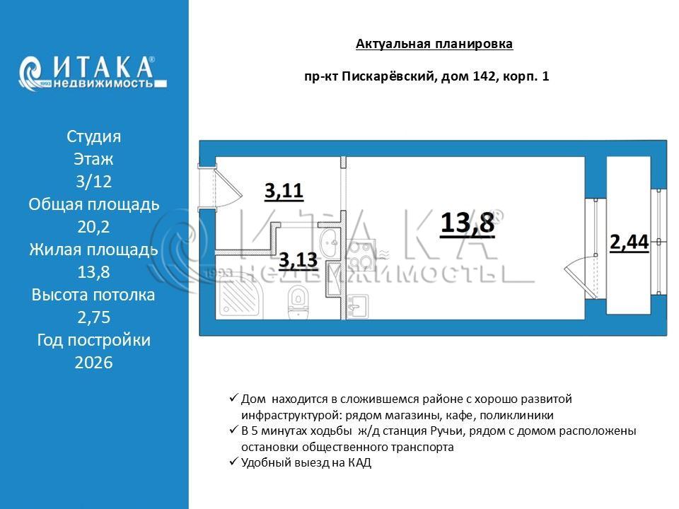 Студия в новом доме!Квартира расположена на комфортном 3 этаже жилого комплекса комфорт класса «Академик». Этот ЖК построен по кирпично-монолитной технологии, что обеспечивает тепло в квартире и хорошую звукоизоляцию. Дома имеют небольшую этажность- всего 12 этажей. Квартира сдана в черновой отделке, а комната 13,8кв.м широкая, что позволит Вам реализовать любые дизайнерские решения. Ключи уже получены, собственность оформлена. Из комнаты имеется выход на широкую застеклённую лоджию площадью 2,4кв.м, на которой можно установить системы хранения и освободить комнату. Прекрасная транспортная доступность:Жилой комплекс расположен в 5 минутах ходьбы от ж/д станции Ручьи, прямо рядом с домом расположены остановки общественного транспорта, на котором легко добраться до метро Академическая или Гражданский проспект, а также доехать до центра города. Недалеко выезд на КАД. Дом находится в сложившемся районе с хорошо развитой инфраструктурой: рядом магазины, кафе, поликлиники. А детский сад и школа построены прямо на территории комплекса. - [ ] ЖК комфорт класса- [ ] Комфортный 3 этаж- [ ] Развитая инфраструктураЗвоните! И я отвечу на любые Ваши