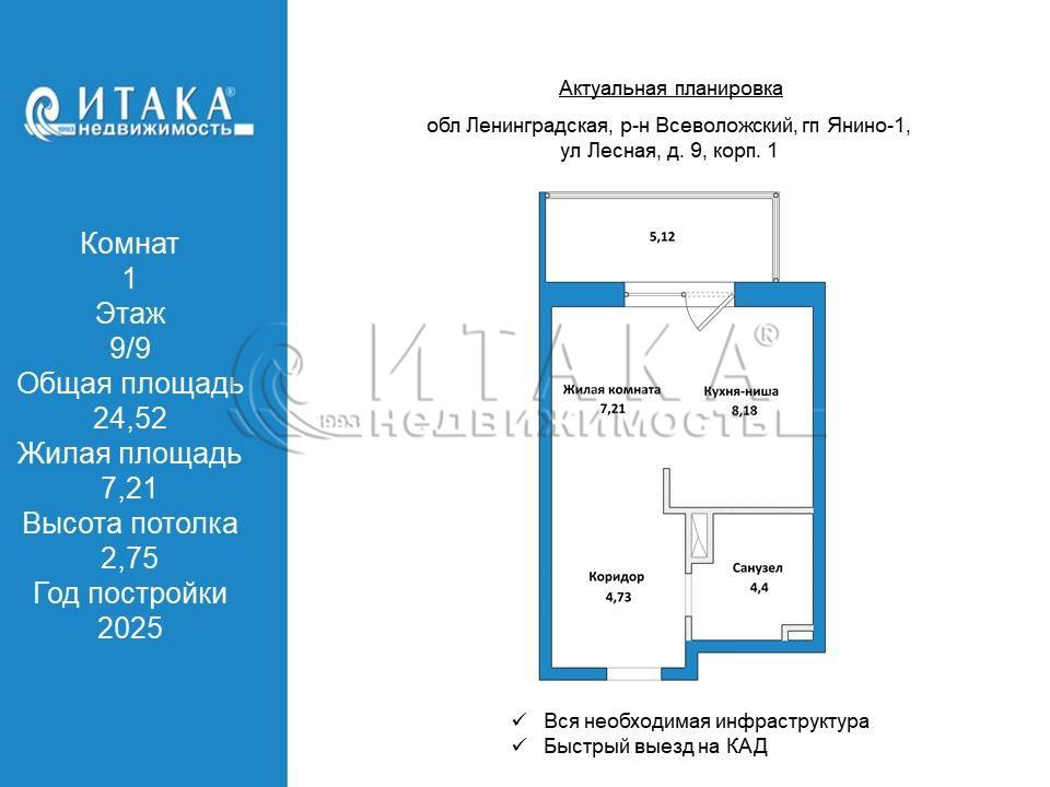 Старт к новой жизни в своей уютной студии!Эта светлая и просторная студия 24,52 кв.м. на 9 этаже — идеальный вариант для тех, кто хочет начать свой путь к независимости и комфорту.Большая кухня-гостиная 15,39 кв.м. — единое пространство для отдыха, работы и встреч с друзьями. Здесь легко разместится диван, стол и всё, что нужно для уютного ритма жизни.Прихожая 4,73 кв.м. продумана до мелочей — можно установить вместительную гардеробную и навсегда забыть о беспорядке.Санузел 4,40 кв.м. правильной формы — удобно расставить мебель и сантехнику без компромиссов.Балкон 5,12 кв.м. — отличное место для завтрака с видом на город или вечернего отдыха.Квартира полностью готова к проживанию: качественная чистовая отделка, обои под покраску, плитка в санузле, межкомнатные двери и современная сантехника — просто заезжай и живи!Отличное решение для молодого специалиста, студента, пары или инвестора — стильное, удобное и доступное жильё, где всё начинается с чистого листа.Это современный европейский пригород Санкт-Петербурга, где всё продумано для комфортной и красивой жизни, но при этом доступно по цене.Ваш собственный старт к независимостиЭта студия — идеальное решение, чтобы начать свой путь к мечтам.Без лишней суеты, без переплат, зато с уютом, безопасностью и ощущением «своего места».Пусть это первая квартира — но уже с атмосферой полноценной жизни!Чистый воздух и спокойствие рядом с городомДо КАД — всего 2 км, до метро Ладожская или пр. Большевиков — 25 минут.Вы живёте рядом с городом, но без шума и суеты. Вокруг зелень, свет и ощущение простора.Всё нужное — у порогаВнизу — магазины, кафе, аптеки, салоны красоты.Утром — кофе на вынос по дороге на работу, вечером — прогулка по тихим дворам без машин.Жизнь становится удобной, даже если она только начинается.Для активных и вдохновлённыхФитнес-зоны, скейт-парк, футбольное поле, каток зимой — всё для тех, кто выбирает движение вперёд.А если хочется расслабиться — шезлонги и уютные аллеи ждут вас прямо во дворе.Начните с малого — получите больше!Здесь легко почувствовать себя дома, даже если вы только делаете первый шаг к самостоятельной жизни.Пусть эта студия станет вашим трамплином в светлое будущее — уютным, современным и по-настоящему вашим.