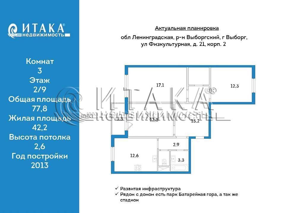 128601109 Продаётся уютная трехкомнатная квартира площадью 77.8 квадратных метров на втором этаже девятиэтажного панельного дома, расположенного по адресу: г.Выборг, Центральный микрорайон, ул.Физкультурная, дом 21 к2. Строение 2013 года обладает современной инфраструктурой: в шаговой доступности находятся школа, детский сад, торговый центр, парк и фитнес-клуб.Квартира впечатляет своей продуманностью и комфортом: Жилая площадь составляет 42.2 квадратных метра, кухня занимает 12.6 квадратных метров, предоставляя достаточно места как для приготовления пищи, так и для семейных ужинов. Комнаты все изолированы. Между комнатами просторный холл 13.2 м2. Современный евро ремонт выполнен с использованием качественных материалов, создавая приятную атмосферу уюта и тепла. К вашим услугам раздельный санузел и один балкон, откуда открывается вид на тихий двор.Для маленьких жителей комплекса во дворе оборудована детская площадка, а спортивная площадка позволит поддерживать форму и взрослым. Возле дома две большие парковки. Удобство парковки обеспечивает специально организованная территория со шлагбаумом.Приобретая эту квартиру, вы выбираете жизнь в гармонии с природой и удобствами городской инфраструктуры, где каждый день наполнится радостью и комфортом. Для любителей прогулок на природе рядом с домом есть отличный парк Батарейная гора, а так же стадион, где можно проводить замечательно время и заниматься спортом.Звоните, заранее записывайтесь на просмотр квартиры. Рассматривайте для покупки.Итака. Работаем с 1993 года.Итака. Работаем с 1993 года.
