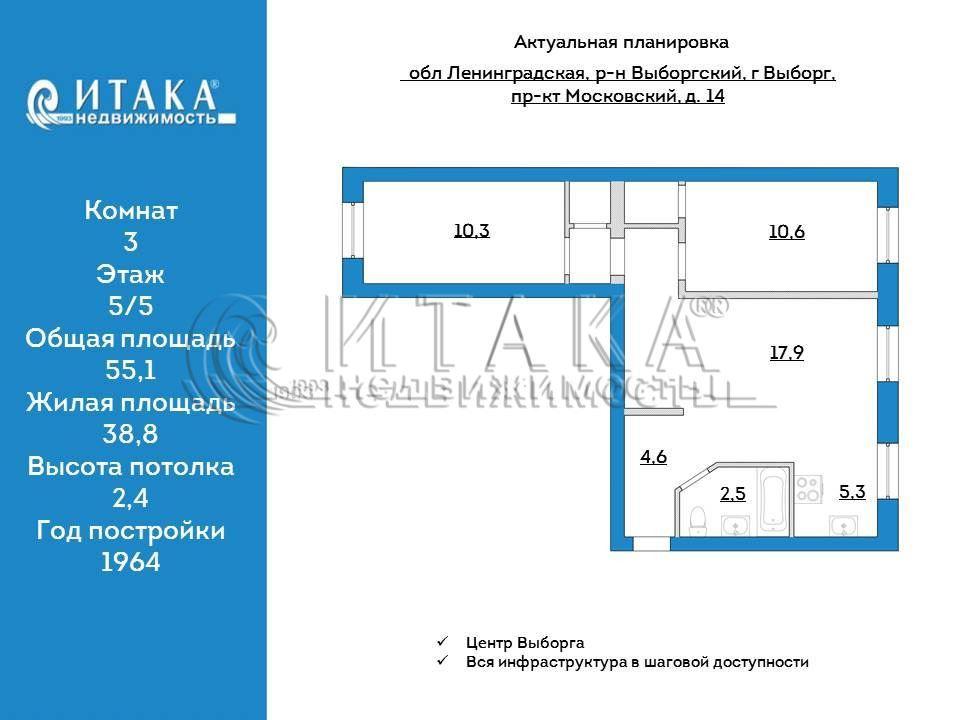 1-90187 Продажа трехкомнатной квартиры общей площадью 55,1 кв. м в центре г. Выборга. Дом кирпичный теплый. Кухня объеденена с большой комнатой, получилась кухня - гостиная. Плюс спальня и детская.Вся инфраструктура в шаговой доступности: Школа, детский сад, магазины. Рядом парк для отдыха и прогулок по проспекту Ленина., лесопарковая зона на Батарейной Горе.Интересный вариант для сдачи квартиры в аренду. Подходит под любые формы расчета.Ждем ваших звонков для просмотров!Итака. Работаем с 1993 года.