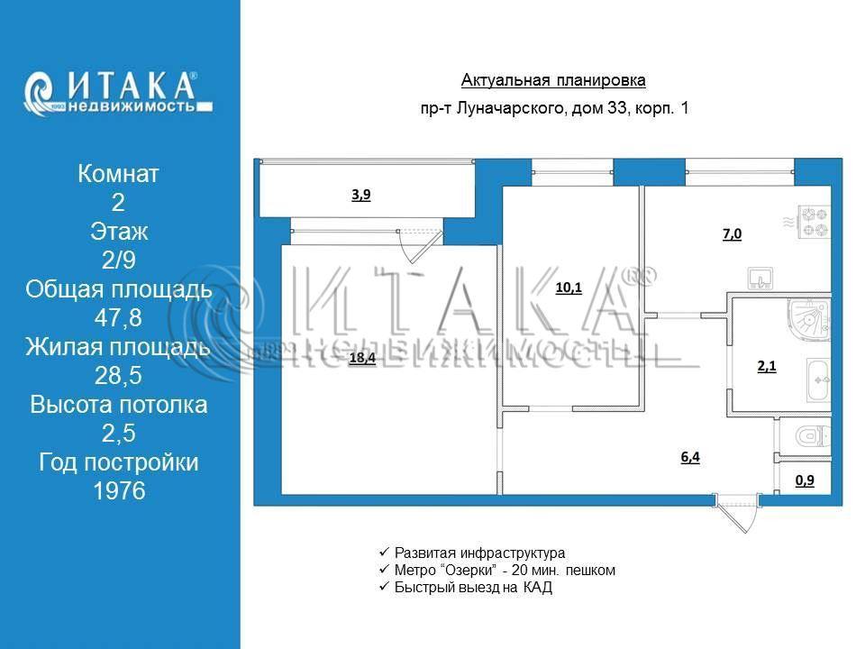 1-92149 Предлагаем к продаже уютную 2х комнатную квартиру общей площадью 47,8 м,комнаты изолированные 18,4 10,1м, просторная лоджия в добротном, тёплом доме на проспекте Луначарского дом 33, корпус 2 Безупречная локация! В шаговой доступности магазины, аптеки, школы, детские сады, пол-ки, медицинские центры, сетевые магазины : Дикси, Пятёрочка, Магнит, Перекрёсток, Окей, Лента и др Сосновский парк , торгово-развлекательный комплекс Родео-Драйв, фитнес- клубы, метро Озерки - 20 мин. пешком или 7 мин. на транспорте. Всё необходимое рядом! Отличная транспортная доступность, метро Политехническая , всего 10 минут на транспорте. Быстрый выезд на КАД, в Центр и другие районыДом находится в зелёном, уютном дворе. Полная стоимость в договореИтака. Работаем с 1993 года.