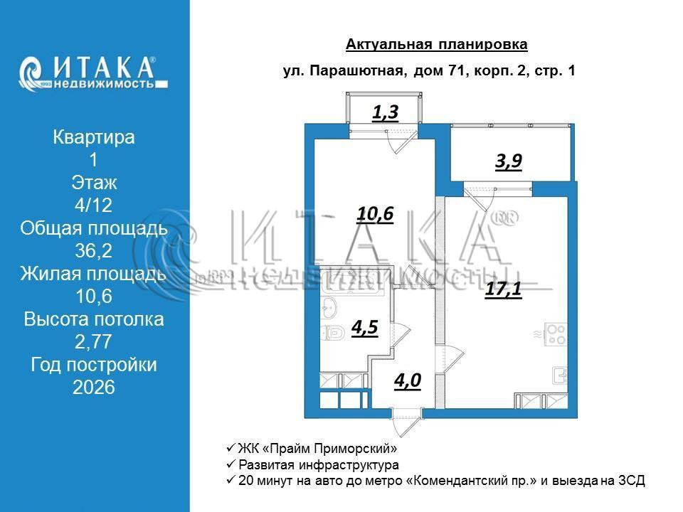 1-92947 Евро-двушка 36 м с ремонтом и ДВУМЯ балконами! ЖК «Прайм Приморский»Продается просторная 1-комнатная квартира европланировки (евро-двушка) в новом кирпично-монолитном доме (ЖК 2026 г.). Главная фишка — у вас будет и лоджия, и французский балкон! Это делает квартиру невероятно светлой и функциональной.УНИКАЛЬНАЯ ПЛАНИРОВКА, выбирали для себя, таких планировок в продаже нет (36,2 м):**Кухня-гостиная (17,1 м): Огромное пространство для жизни и приема гостей. Панорамные окна и выход на утепленную лоджию (3,9 м).**Изолированная спальня (10,6 м): Правильной формы, тихая и уютная. Собственный выход на французский балкон (наслаждайтесь закатами и воздухом, не выходя из комнаты!).**С/у (4,5 м): Совмещенный, достаточно места для стиральной машины.**Прихожая: Есть ниша под встроенный шкаф (порядок в коридоре гарантирован).ДОМ И РЕМОНТ:**4 этаж, окна во двор. Панорамное остекление — много света в течение всего дня.**Готовая отделка от застройщика: Светлые обои под покраску, качественный ламинат и сантехника, натяжной потолок. Заезжай и живи!**Тихий двор, зеленая зона, видеонаблюдение, закрытый двор, детские и спортивные площадки.ЛОКАЦИЯ И ТРАНСПОРТ:* В шаговой доступности остановки. 18 минут пешком до будущей станции метро «Шуваловский проспект» (инвестиция в рост стоимости).* 20 минут на авто до метро «Комендантский пр.» и выезда на ЗСД.* Рядом гипермаркеты Лента, Лемана Про, кафе, школы и детсады.* Потрясающие виды на Новоорловский заказник и Шуваловский карьер — природа за окном!УСЛОВИЯ СДЕЛКИ:* Прямая продажа, чистая сделка, собственник на месте, ипотека Сбербанк, что гарантирует безопасную сделку и удобный взаиморасчет.* Полная стоимость в договоре.* Подходит под любую ипотеку (бесплатно поможем с одобрением).* Материнский капитал — рассматриваем.ЗВОНИТЕ ПРЯМО СЕЙЧАС! Отвечу на все вопросы, покажу документы и организую просмотр в удобное для вас время.Итака. Работаем с 1993 года.