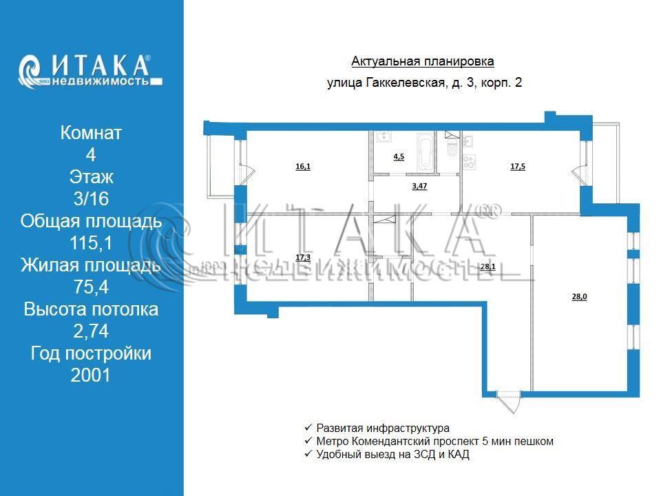 1-92391 Отличная цена для такой квартиры!Предлагается в прямой продаже отличная трёххкомнатная квартира 115,10 кв.м. в кирпичном доме, в 5 минутах пешком до метро Комендантский проспект, на комфортном 3 этаже. В квартире сделан свежий, качественный ремонт с применением дорогостоящих импортных материалов. Просторная кухня 17.5 кв.м. Красивая, белая кухня Puustelli производства Финляндии ( там и приобреталась), которая останется новым владельцам. Вместительные шкафы в прихожей. Выровнены стены, полы. Заменена проводка. Установлены ПВХ окна. В квартире много естественного света и хорошая вентиляция. Есть кладовка. Окна выходят на 2 стороны, в зелёный двор, где расположены детские площадки. Хорошее расположение дома. Удобный выезд на ЗСД и КАД. Близость гипермаркетов Максидом, Лента, О'кей,МЕТРО. Школы и детские сады . Остался небольшой остаток по ипотеке банка ВТБ. Либо при продаже можно переоформить ипотеку, либо готовы сами погасить. На ваше усмотрение.Итака. Работаем с 1993 года.