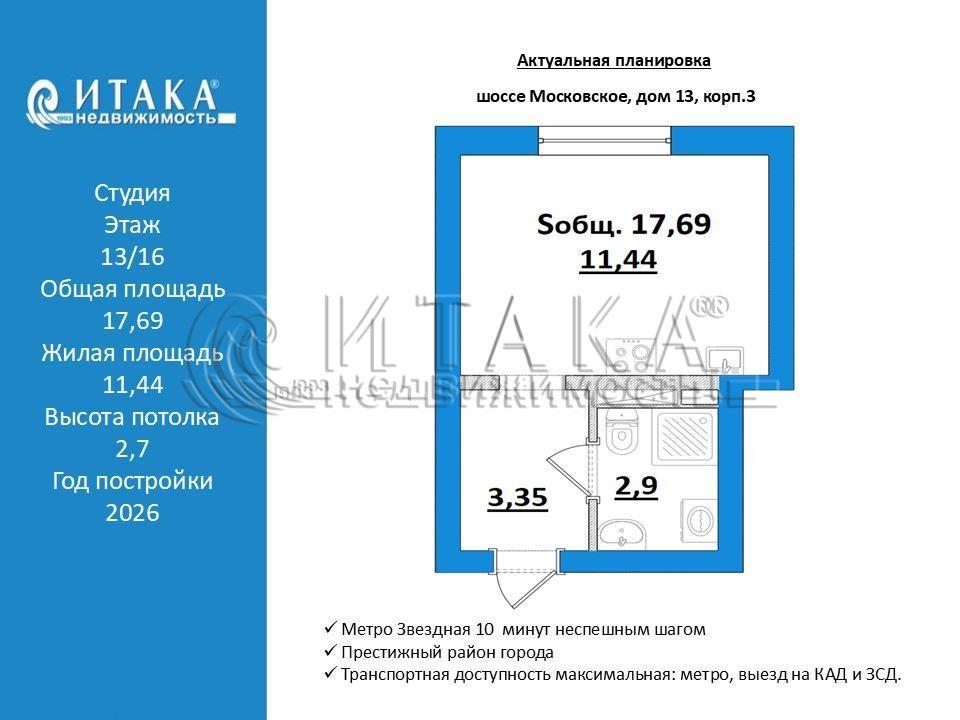 5-3457996 Апартаменты для Жизни или для Пассивного дохода!Высокая степень готовности дома.От Метро Звездная 10 минут неспешным шагом.Престижный район города, транспортная доступность максимальная: метро, выезд на КАД и ЗСД.Все апартаменты сдаются с чистовой отделкой, а это значит - никаких утомительных длительных ремонтов, тишина в доме с самого начала заселения.У застройщика дополнительно можно заказать меблировку.На первых этажах корпусов будут открыты: спортивный зал, мини-маркет, магазин цветов, коворкинг, салон красоты, ресторан и др.Круглосуточная консьерж-служба, аренда автомобилей, химчистка и прачечная – к услугам жителей апарт-отеля.На первом этаже расположатся номера для маломобильных групп населения.На внутренней территории апарт-отеля будет выполнено качественное благоустройство, установлены площадки для спорта, игр и отдыха,высажены деревья, кустарники и цветы.Высокая степень готовности дома!Можно съездить на просмотр.Звоните, расскажу подробнее.Аргументированный торг обсуждается.Итака. Работаем с 1993 года.