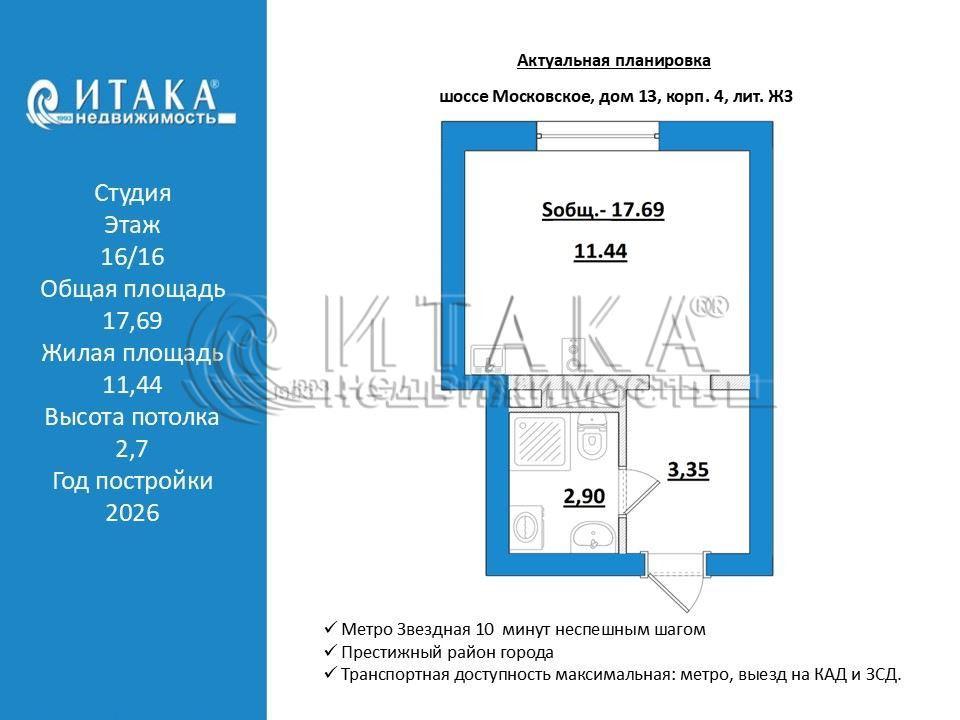 5-3457997 Видовые Апартаменты!Высокий этаж 16-й из 16-ти, без соседей "сверху", идеальный комфорт и тишина.Для личного проживания, для инвестиции или для сдачи в Аренду.Высокая степень готовности дома.От Метро Звездная 10 минут неспешным шагом.Престижный район города, транспортная доступность максимальная: метро, выезд на КАД и ЗСД.Все апартаменты сдаются с чистовой отделкой, а это значит - никаких утомительных длительных ремонтов, тишина в доме с самого начала заселения.У застройщика дополнительно можно заказать меблировку.На первых этажах корпусов будут открыты: спортивный зал, мини-маркет, магазин цветов, коворкинг, салон красоты, ресторан и др.Круглосуточная консьерж-служба, аренда автомобилей, химчистка и прачечная – к услугам жителей апарт-отеля.На первом этаже расположатся номера для маломобильных групп населения.На внутренней территории апарт-отеля будет выполнено качественное благоустройство, установлены площадки для спорта, игр и отдыха,высажены деревья, кустарники и цветы.Высокая степень готовности дома!Можно съездить на просмотр.Звоните, расскажу подробнее.Аргументированный торг обсуждается.Итака. Работаем с 1993 года.