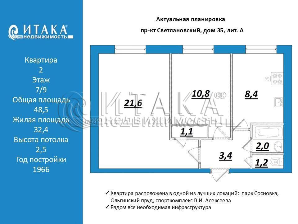 1-93026 Двушка в кирпичном доме у Сосновки / 48,5 м / комнаты 21,6м и 10,8м/ под ремонт.В продаже двухкомнатная квартира в кирпичном доме 1966 года постройки.Расположена в одной из лучших локаций: парк Сосновка, Ольгинский пруд, спорткомплекс В.И. Алексеева.Тихий зелёный район, развитая инфраструктура, во дворе детский сад, школа, через дорогу гимназия, магазин пятёрочка на первом этаже.О квартире:· Общая площадь — 48,5 м· Кухня правильной квадратной формы площадью — 8,4 м· Комнаты: 21,6 м и 10,8 м — отличная раздельная планировка· Этаж: 7 из 9· Высота потолков — 2,5 м· Окна выходят на Светлановский проспект.Состояние:Квартира требует ремонта, подходит для тех, кто хочет сделать ремонт "под себя". На момент продажи освобождена и готова к заезду бригады.Кирпичный дом — высокая тепло и шумоизоляция.Продажа прямая — два взрослых собственника. Полная юридическая готовность к сделке, квартира с прозрачной историей - длительно во владении одной семьи, расскажу подробнее при обращении. Быстрый выход на сделку.Показы: по договоренности.Итака. Работаем с 1993 года.